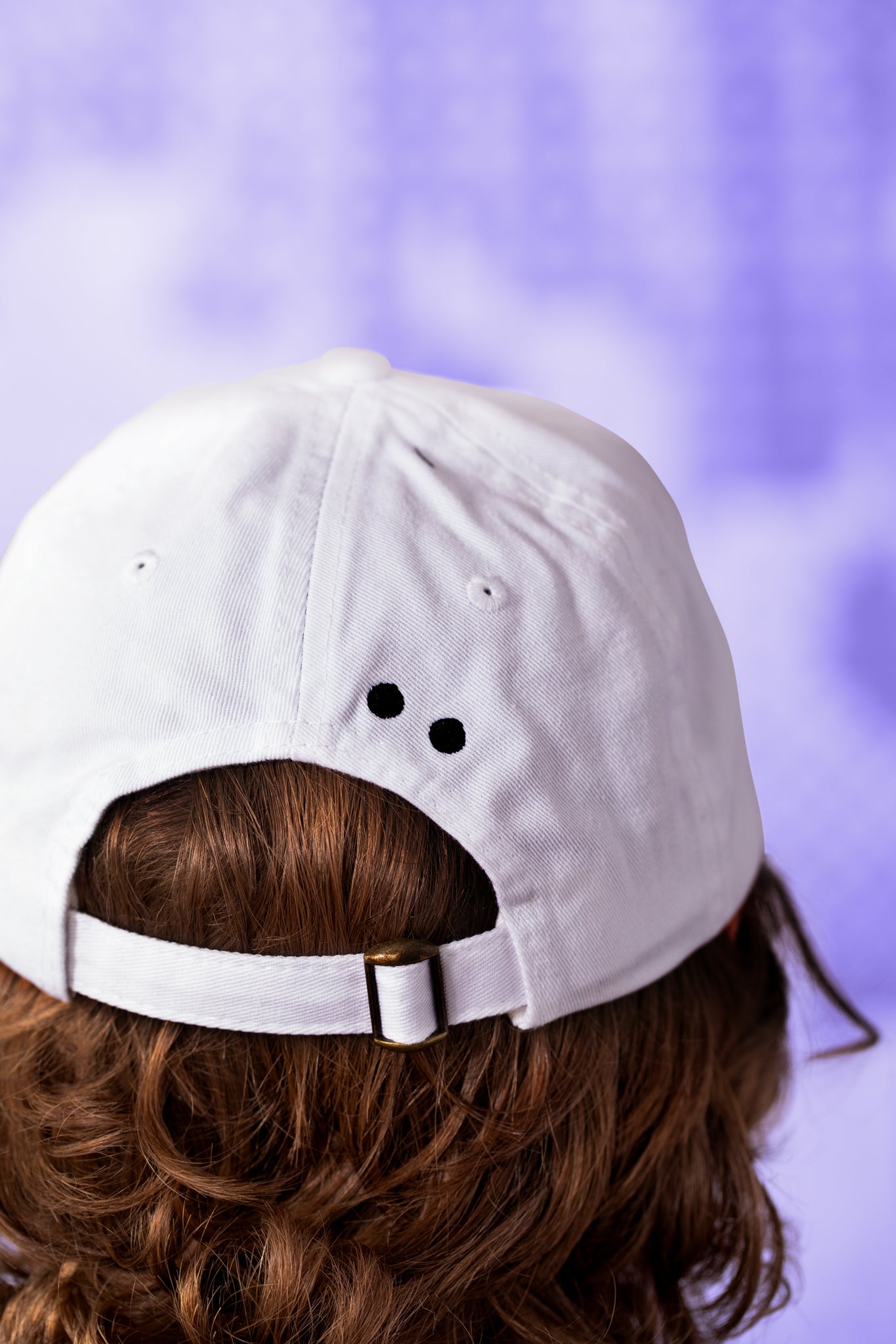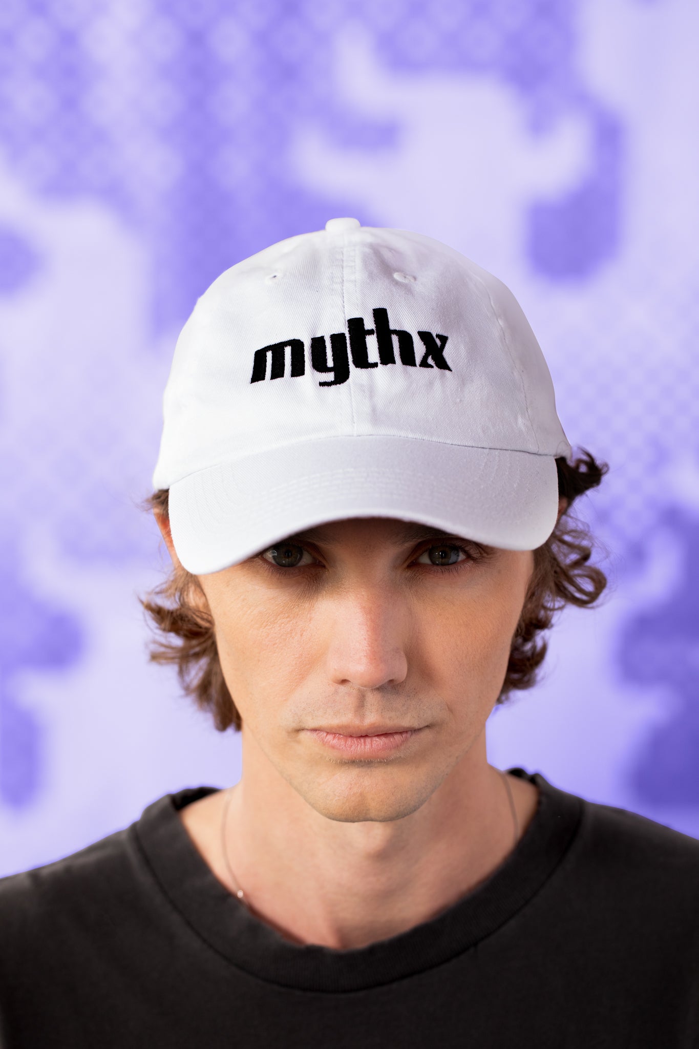 Crisp white cotton hat embroidered with the Mythx logomark + Eyes on the back. Adjustable buckle closure for a custom fit.